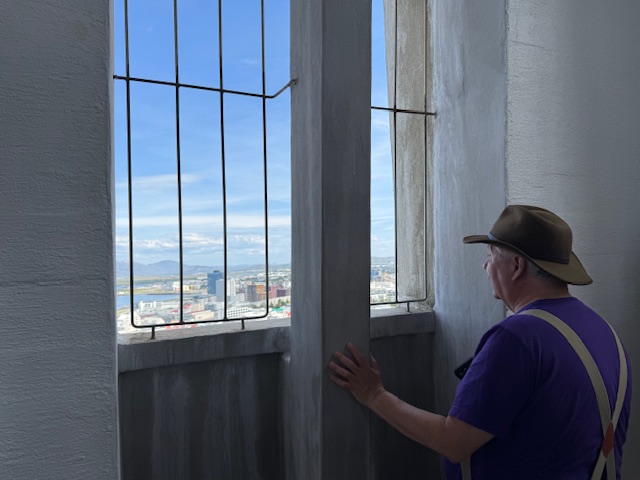 It was warm and sunny, with the high sixties, which felt sweaty to us now. We continued walking up to the Lutheran Hallgrimskirkja. Today, we purchased tickets to the tower and soon found ourselves looking out the barred, open-air windows.