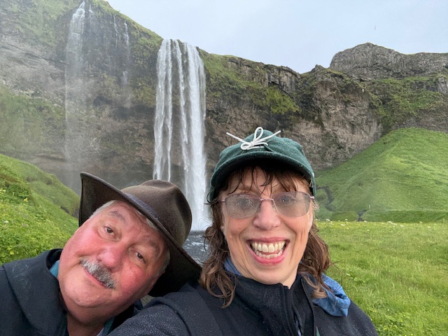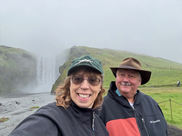 The first stop was a waterfall (their names now all run together). There was a long walk to an overlook, but our guide warned us that the stairs were slippery and the view was not great — we skipped the steps. The steps also, I read, are the start of the trek into the glaciers and not a particularly safe one (there were dire warnings on being adequately prepared and not to do this in winter).