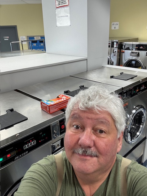 An hour of spinning allows me to write the blog. The crowd is a mix of Spanish-speaking people who seem confused by the process and older Americans like me who are here to get’er done. The attendant, an older gal in homemade clothing, steps up and helps them when their washer halts. It is leaking as they have not properly closed it. I finished my shirts early. I like to have them finish drying on hangers, and there were 30 minutes left on my dryer. I got one of the Spanish-speaking families to use the dryer, saving them 50 cents.