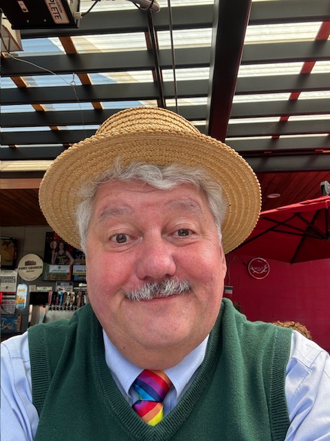 There were a few clouds in the sky, but no rain in the forecast, and it would be another 50°F to 80°F day. I shower, and all that, and dress in a dress shirt, a Pride tie, a green sweater vest, blue slacks, and a straw hat. While Oregon is a come-as-you-are style place, and our pastor often wears Hawaiian shirts, shorts, and sandals, I go the other way and try to look neat and well turned out.