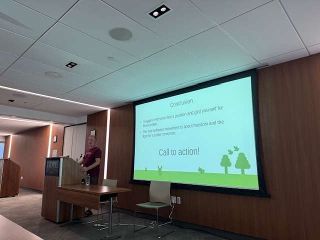 Next, I grabbed a prepackaged sandwich and more coffee, paid $15, and quickly ate them. I found the presentation by the Free Software Foundation (GNU, to some of us). I learned that the idea was published by Richard Stallman and got started back in 1983 (while I was in college). The presenter, Craig Topman, sought a solution to help the world and alleviate some of the madness. He found that working for the Foundation allowed him to make a meaningful difference. He made a strong case for us to join, listing volunteer positions that need to be filled immediately. There was some interest. I resisted (everyone wants me).