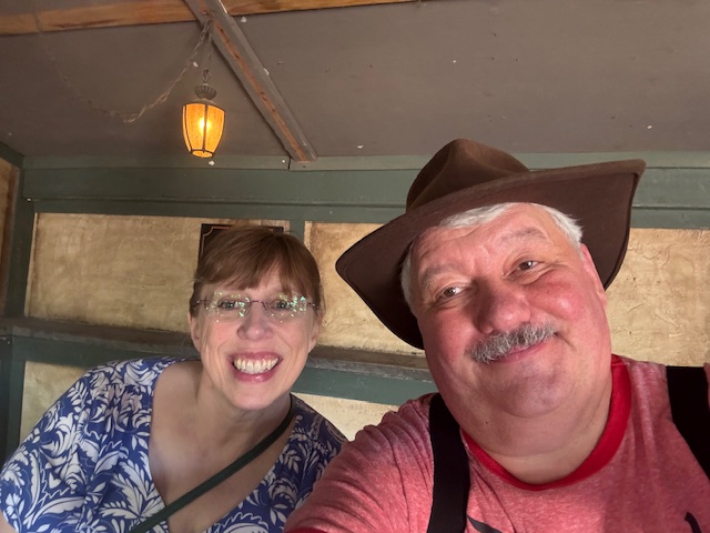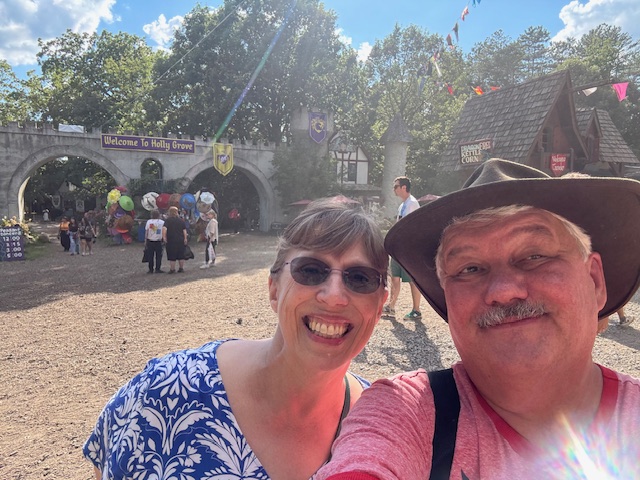 I showered and all of that. I decided on a T-shirt as we were headed to the Michigan Renaissance Festival near Holly, Michigan. It would be warm and dry today. Deborah arrived about an hour later, and I had finished breakfast by then, having already decorated her birthday trip with flights and hotels. I am trying to be there for two weekends, as Deborah will be working during the week, and she coordinates Adult Education in the current cut funding for whatever-it-was-because-it-is-education mode of the Trump administration (F**kers!). I hope to get a weekend and spend her birthday weekend together (we have a romantic weekend in Saugatuck planned with a wine tour).