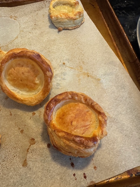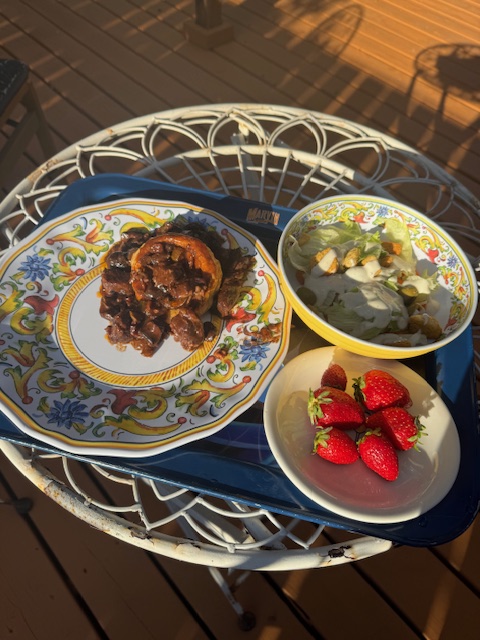 It is an all-day adventure, and I make puff pastry cups (I used frozen purchased dough) to hold the meal instead of potatoes. I wash strawberries, skipping additional flavors and whipped cream. Our Oregon berries, I think, are best alone. I am using Chef Evelyn Stokes’ (here) rework of Julia Child’s recipe. While my cups were not as expected, the meal was good. I ate outside in the sun, and, except for a yellow jacket that wanted to share in my meal, it was an excellent meal. I did get a 1/2 glass of wine, but most of the wine went into the food. I also had just a little extra. I did have a little bowl of ice cream later. Keeping everything to smaller portions.