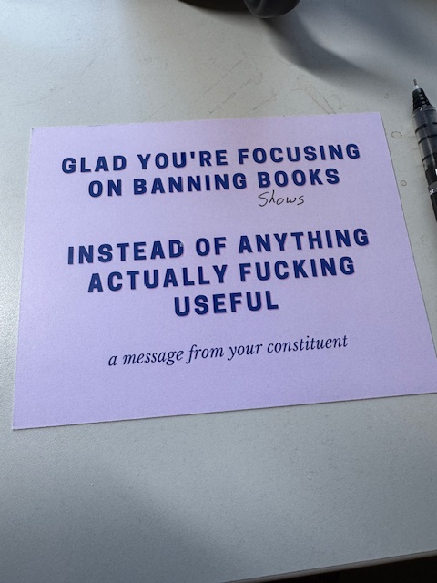 With that done and the afternoon disappearing at an alarming rate, I wrote a card to Mom Wild. I had earlier written a postcard to the FCC chairman. I was happy to find one with the correct sentiment I wanted to share with Mr. Carr.
