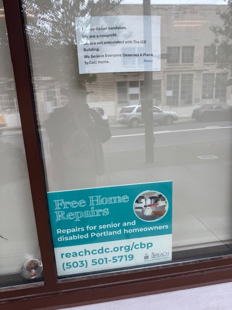 Needing more steps and feeling refreshed by food, I head to the ICE building using my iPhone maps. No surprise that it is on the map app. There, I find a small crowd and a single boarded-up building in a boring part of town near The Old Spaghetti Factory on the river. There were a couple of tents on the sidewalk, along with some grills, to make dinner around the corner and out of rubber bullet range of the Federal building (something I am sure I learned from the first protests). With one exception, it was a sleepy and bored group of about ten near the building. I took a selfie. I took photos of nothing happening.
