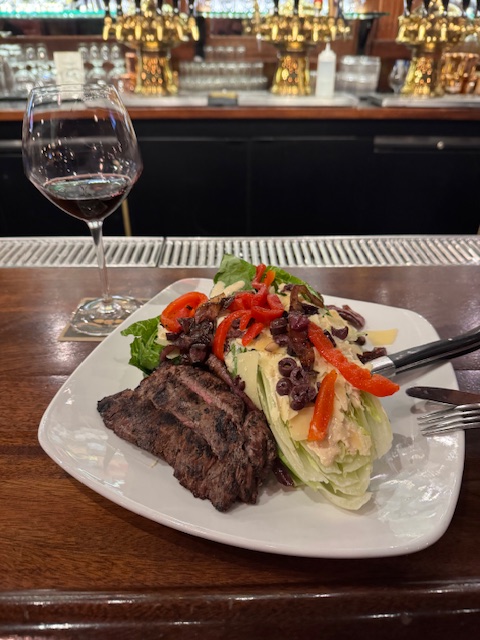 I find I am alone for dinner and head to the Golden Valley Brewery as I cross Beaverton again. I sit at the bar and recognize one of the bartenders, and Devan, a new face, waits on me. This is not a cheap place, and I visit less now that I would rather spend my money on travel (and the caloric impact is unnecessary). I have a glass of wine, Merlot from Argentina, and the steak salad, and I add dessert with coffee. It was all good and familiar; they make excellent food here.