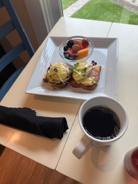 Today we rose around 7 something and relaxed and enjoyed the time together. We had the fireplace running until it got too toasty and made coffee in the Keurig. The Hotel Saugatuck is lovely, offering a selection of coffees for the Keurig in our room, and I have also purchased Trader Joe’s capsules. We had plenty of coffee. Breakfast is served a bit late, 9:15 or so, and despite all the time, we managed to be a few minutes late for our wine tour guide, Jason, with Bottle Run. My colon, revised by colon cancer repairs, decided to surprise me a bit. But all was good, and Jason was fine waiting. It was Deborah and me for his run today.