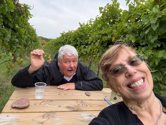Jason packed up lunch for us and added more wine to our collection in his vehicle. We drove longer this time to the Michigan Wine Company. We had a table in the vines, where we even picked a small bunch of grapes. They bring you wine in small stemless glasses. The 2024 Noir-Yay!, a sparkling red, was terrific. Other sparkling wines were one-dimensional in flavor, but this one had a bright red finish that made it stand out. There, the whites, I am afraid, were uninteresting, but we were on our fourth vineyard, I was sloshed, and we likely did not fairly judge them. So I would suggest, dear readers, you ignore my rating of the Michigan Wine Company and try it. The 2022 Petite Foch should have stood out for me, but was eclipsed by Veritas Estate’s heavy yet excellent reds. Deborah loved the Plum Cider and got some to take home. It was excellent. Recommended and in short supply, we were told.