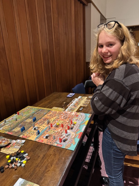 Wednesday ended with me home after playing a newish game against Z on a table pushed into the sanctuary at First United Methodist Church. The refresh demolition is done, and the refresh work has now started. It will not be done until before Easter (and likely to end in January, but I am making no promises). We played Raiders of Scythia, a revision of the Viking-themed game, and read that it is better than the Viking-themed version, Raiders of the North Sea (without the final add-on, which, I am told, tips the scale to the Viking game), and I like the art and style better. Z enjoyed the game and lost by one point. Her gamer instincts were good, and she pounced on the easy goals before I could. I instead went on more raids and took more risks, since they involve dice rolls, and I lost most of my crew in one raid. Z built up again, going with good game instinct, and then took on the most brutal and highest-point raids, catching her up on points. It was my purchase of a horse in my last turn—yes, a single two-point horse —that won me the game. Z loved the excitement of the raids, the slow build, and creating a crew with wonderful-looking cards and powers.