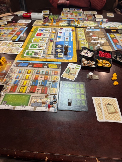 Before this, I managed to score lower than my best and last of four in another try at the board game Grand Hotel Austria at Richard’s house. Laura led the whole time, but then Ricard broke out, finding a new engine in the game. Kathleen was distant from my score. I still like the game, but the wait for turns can be long, and there is no reason to look at the board, as it changes all the time, until it is your turn. Richard and Laura think the game is a bit random with the staff cards and relies on dice rolls for part of turn control.