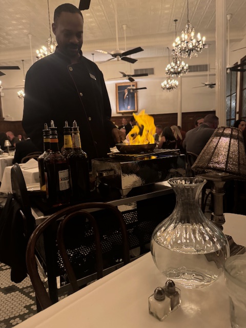 While expensive, it is not overly so, and we had a great time there (about $120 each with drinks and dessert). I had the veal, Dondrea the quail, and the best Filet Mignon I have tasted (we all shared). We all tried the excellent turtle soup, and it was the first time any of us had anything like it. It was a complex, smoky flavor. We added their famous soufflé potatoes and okra. The service is an art and a performance that you will not often find with old-school meals. Customers, there is a dress code, and I was reminded to hang my hat on a hook. Most are dressed up a bit, but with few ties. We had dressed up a bit for dinner. Our last treat was Banana Foster for Dondrea and me (Donna picked a baked Alaska), which burned at the table—spectacular—and we got some glances from other diners for the show.