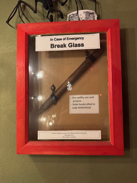 We had drinks, mine the AB+, which is their version of a Sazerac, Donna and Dondrea found other blood types that fit their tastes. We ordered some excellent appetizers (still full from breakfast): fried deviled eggs, pork belly bits, and baked Brie (with walnuts on the side, as Dondrea is allergic to them). Our waiter brought us a book from the owner about the local vampires, with a suggestion to look for her at the other restaurant if we bought it and wanted it signed. Dondrea picked up a copy. Our waiter retold the coffin girls’ story (here) and then granted us a pass to Potions. We also were ‘bit’ and she handed us decals to wear showing the bite marks (we did not get those on yet).