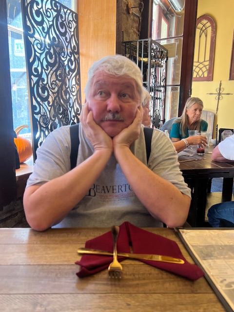 A tall man with fangs found us a table. The napkins were red and folded in a bat form. The silverware was across it, suggesting a cross. The place was appropriately gothic. Later, a man in a kilt would sit next to us. He had a marine belt over his kilt, and we soon struck up a conversation with him. He was here for a fair, trying the place out.