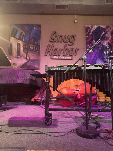 Chuck Redd Vibes Quartet was at Snug Harbor off of Frenchman Street in Marigny, not the Quarter, and we had tickets for four. Before this, we had a chaotic dinner at Snug Harbor Jazz Bistro, but the food was excellent. I had fried oyasters with, of all things, a usual baked potato with the usual fixings. Ken had three bowls of their local flavors: Jambalaya, gumbo, and estouffée. Dondrea and Donna, still stuffed from brunch, split a burger with a baked potato. Donna and Dondrea finished first and headed out to the stage to get us our table. Ken and I followed after we finished and paid the bill.