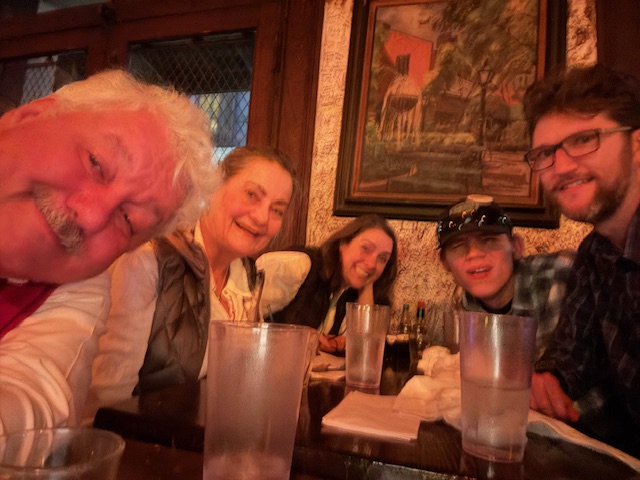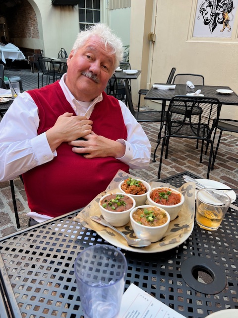 We had to wait before this as the folks arrived from the airport, all our flights worked, and we collected at Nepolean House. The hostess, looking besieged on a Sunday Night (but it was a game night for the Saints, the much-decried local NFL team), waited for us to collect everyone. A group of two tables inside (out of the cold wind) became available just as folks arrived. We were soon seated, and we enjoyed various sandwiches. Dondrea, Donna, and I got our excellent bread pudding, while Michael R. and Seth split a hot muffalata sandwich. Ken, Kathy, and Doug were at the other table and tried various sandwiches, including another muffalata. We chatted and caught up. There we left for Bouban Street and enjoyed some of the street bands on our way to Friztel’s. Bourban Street was already loud, but the crowd was subdued and cold. The wind was sharp now that the sun was done!