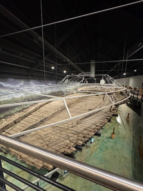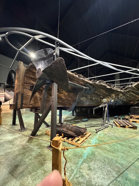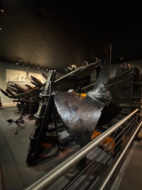 We finally had everyone and thought we were 30 minutes from the planned start, but we were soon off and crossed Columbus, Georgia, to the museum on the Chattahoochee River. The city is at the brink of the falls and the limit of the navigable river. Brandon shook my hand as I was a member. He is the museum director and is taking a turn at running the ticket booth and gift shop today. Once our group got assembled and with tickets, we explored the gift store (He showed some of the real Confederate money, Brandon gave an introduction, and then went over to the main attraction, the over 100-foot wreck of the CSS Jackson that was salvaged in the 1960s and now resides in this independent non-profit museum organization (this is not public owned or funded museum). The stern (rear) of the CSS Chattahoochee was recovered when the CSS Jackson was salvaged and is also included in the displays, along with its engines. The view of the CSS Jackson remains takes your breath away. Though burned to the waterline, the original lines are reconstructed by a metal framework over wreckage, and it gives you a feeling for this, the last of the ironclads.