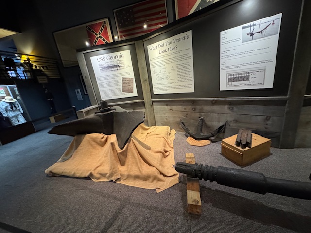 I was happy to see two wrecks, but discovered as we explored the remains of the CSS Alabama (a gun recently salvaged from the famous wreck), lost cargo from the wrecked CSS Georgia when it tried to run the blockage, bits of the CSS Virginia (yes, the former USS Merrimack), the flag of captured ships (on both sides), and the flag from the CSS Arkansas (the wreck is likely buried under a levy and unreachable).