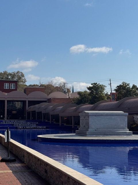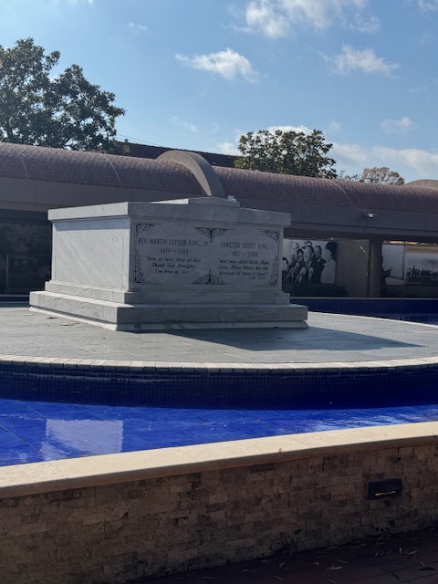After the service, we walked over to the historical church, now unused, and took pictures. Around the corner is the King Center, which is open, and there are the graves of MLK and his wife in a reflection pool. The eternal flame is still out; it was recently vandalized and has not yet been restored. Freedom Hall also offered another bookstore and merchandise. There, I picked out some small things that fit easily in my luggage. I was chatting with the staff, laughing and telling stories.