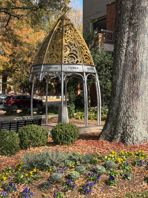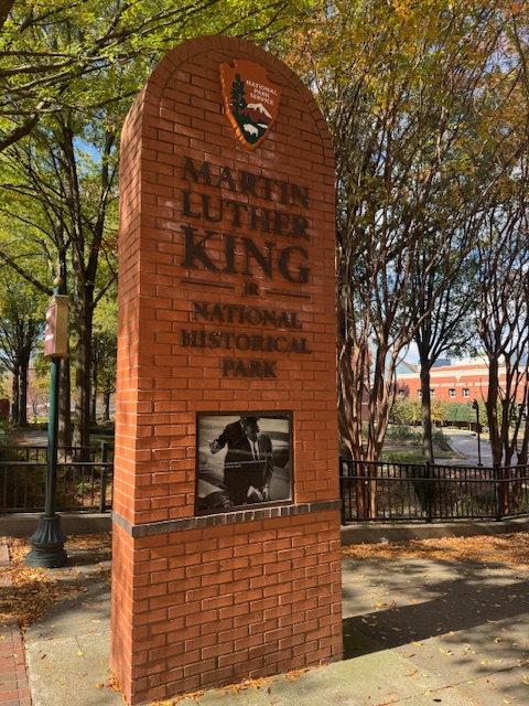 The soundtrack was a replay of MLK speeches while I sat properly on the bench, and being here at his and his wife’s grave, hearing his words on a perfect fall day here in Atlanta, made my eyes damp. Another powerful reminder, within sight of Ebenezer Baptist Church and around the corner from the home where Martin Luther King Jr. was born, of the movement he led here and across the USA.