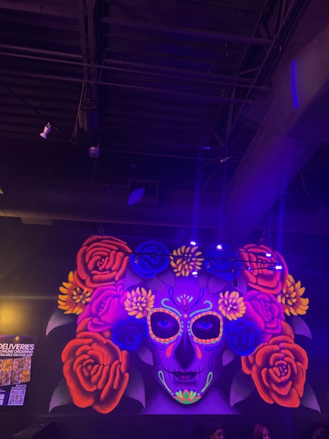 We tried out the waffle joint, but it was only open for to-go orders. Instead, across the street was Laughing Taco, which I saw in my searches and was curious about. The food was marvelous, with a Day of the Dead theme for the place. You had to order on machines; there is no waiter, they deliver the food (or to-go bags), and we found a table and enjoyed too much food (again). It was only a few blocks away, and we were soon back at the hotel.