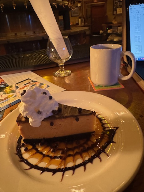 There, I had a dark beer to match the dark sky, then coffee and their surprise dessert (which was surprisingly good and pretty), and arranged with the manager for Theology Pub to have a room on Thursday (tomorrow, at that point). I find it best to be there and have something when asking for a room.