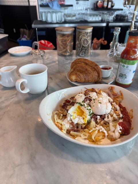 I give Doc and my nurse a sticker from the King Center in Atlanta. They love them. I head, as I usually do, to the bar at La Provence at the Cedar Mills Mall. Demitri is my bartender, and we remember each other and chat here and there about making drinks based on what I learned in New Orleans. I have the hash and a croissant. I also ordered two to-go for my remaining mornings in Oregon.