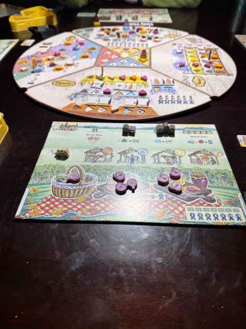 It is dark, very dark, and it takes all 40 minutes to reach Richard’s place. Kathleen is out, and we are playing lighter-efficiency race games instead, Formaggio. In this one, we are cheese handlers, and we must use cheese to gain various point-gaining options. Most are then blocked from the other players. This is the second in the cheese series and is freely mixable, Richard told me, with the first, Fromage. I like it and it is easy to learn, but choices are difficult. I landed in the middle of the scores and saw Richard avoid giving me any points. We play again, and I miss my previous score by 10 points, which sends me to my usual bottom score. Still, it was fun and plays in under 40 minutes. An excellent game and one I could play at the church.