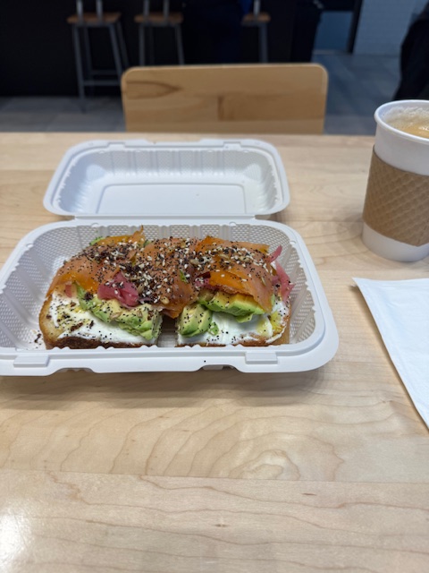 Safe and TSA-acceptable, I headed to Grasso for breakfast/lunch (I would lose three hours due to time changes). I had not done their avocado and smoked salmon toast. The toast was a slice of croissant bread, which I love when I can find it. While lovely to look at, soon salmon and avocado were falling off the bread, from its precarious stack. Still, it was excellent, if messy.