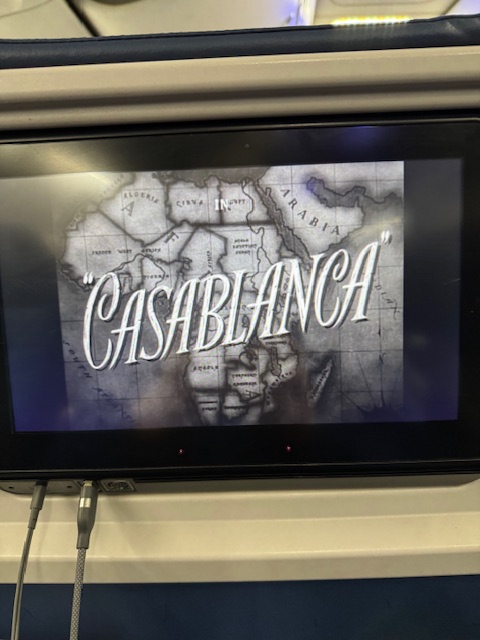 I enjoyed an aisle seat in First Class, 3B. My seatmate at the window soon put on noise-canceling headphones and a mask. We exchanged only a few words. I respected her wishes and watched a movie, the original Casablanca, but my screen was having stop-and-start issues that had me change to reading, but I did finish the film and laughed at all the jokes; it always feels modern to me, though the exploitation of women is hard to forgive (Though Rick foils the attempt as a victory for love).