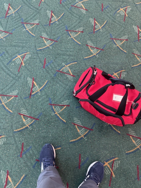 Focusing on the task and our good times, Deborah pulled up to the drop-off, and I unloaded my red bag (which is stoved-in on the corners and has duct tape, too — it’s the last trip after being beaten somehow between here and Morocco two Aprils ago). A goodbye with hugs, trying to say everything; we parted, and I then rolled my wheels to Delta Airlines regular service (there are four in Detroit, separated by International and First/Business Class). I went to the correct one this time. I remembered to retrieve my phone from the DIY check-in and bag tagging process. I dropped my bag and soon found myself in a short line for TSA security, ignoring the slightly shorter pre-Check and other purported-for-fee processes.