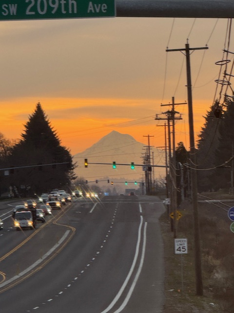 I walked to Tualatin Valley Highway (TV Highway), waiting a long few minutes for the walk signals, and waited only a few minutes for TriMet’s 57 bus to arrive. The sunrise was wonderful with light clouds and Mount Hood stealing the show.