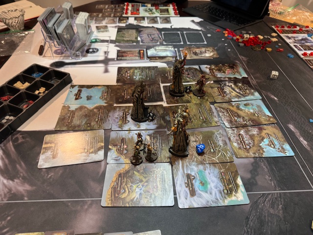 At Richard’s, we finished the setup for the board game Trainted Grail by undoing the manual save process. This is an app-driven cooperative board game with a role playing game (RPG) feel based on a mix of Arthurian post-apocalyptic story freely mixing SciFi and Lovecraftian horror. James bought the game second-hand and with the figures painted dark and scary (an excellent painting job using Object Light Source (OLS) techniques with an airbrush). James is also a completest; he has acquired every add-on and promo for the game, but we are playing the 2.0 rules (and app) without the extras.