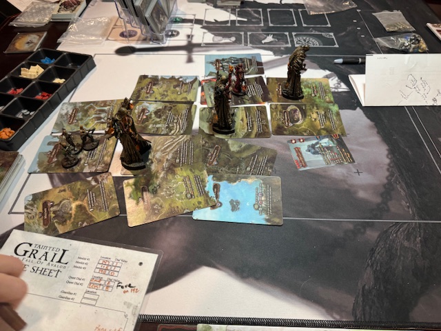 James arrived a few minutes later, coming from Washington State, and soon we took on the mantle of our characters in the board game Tainted Grail. We were optimistic we would make progress on our chapter (the seemingly never-ending chapter 7, notoriously hard to complete, according to what we have read on the Internet), but we made an error and supported the wrong side. This will not shorten our chapter! We found an area we explored before, but now, with properly updated characters, we can dive deep and make a map. We wandered the game board, playing from 9:30 to 1:30, crossing it twice. Only a little progress was made. But we did get more supplies and further developed our characters. Maybe next game!