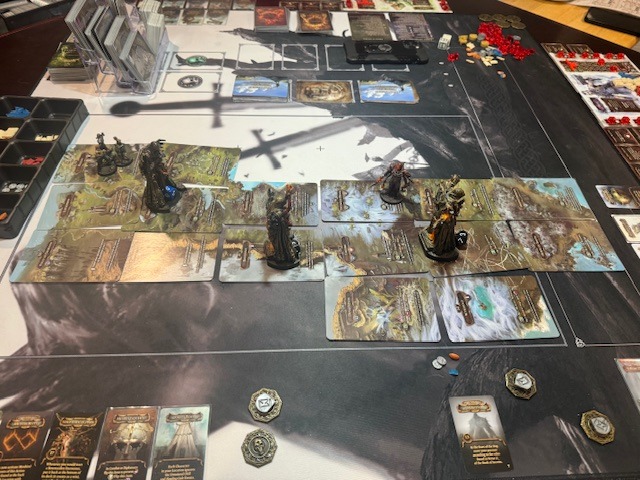 I rose early on Tuesday. I was up at 7, writing the blog and having the last chocolate croissant (I made more that evening—opened the box from Trader Joe’s). I wrote for a while and then dressed and all that. I was soon at Richard’s house in Portland and playing Tainted Grail, my Tuesday game. This is a role-playing and cooperative game, and we had covered the board from one end to another. We had been stuck, and we learned that our decisions in the previous play had left the game deadlocked; we decided to revise them because we had missed one option. This finally granted us, with one more travel across the board, the next part of the story. Yay!