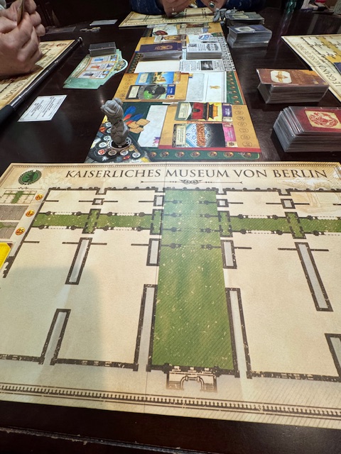 At 5:30, after getting a bowl of soup for dinner, a passable corn chowder, I headed to Richard’s. There I was early, and the game was Museum. I had not played it before. It is a complex card-matching game with three matching processes that I never got straight in my head. Kathleen had it down and won, followed closely by Richard, then me, and then Laura. Our scores at the bottom showed our confusion as we expected some things to score that did not. Still not a bad game, but I think it’s hard to teach and would take two or three plays for me to get it. Others, like Kathleen, got it right off. I thought the game did not flow well, and I have played better games. Still, I would play it again.