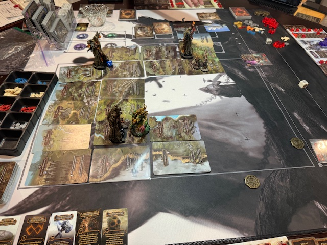 I arrived on time, and Richard had already had the game board for the board game version of Tainted Grail ‘restored’ from its ‘save’. James appeared a few minutes later, having come from the North. We started the game having changed multiple chapters and are now on 11 of 15. We have much of this game down cold, and my memory for stories helps us march across the board. We have buffed our characters (though we lost our equipment as part of the story), and I am now the weakest as my druid Maggot is more of an even character, while Richard plays a combat character and James a diplomacy character. I am now playing a more supportive role.