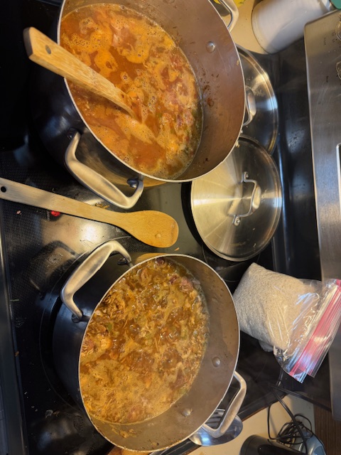 And things go sideways. I added the rice and see that the New Orleans Cooking School says to turn off the pots. My Apple Watch congratulates me on my workout and standing. I cleaned up while waiting. I returned to the pots, and the rice is chalk, and the pots are cold. Ugh! Disaster! I added some water and applied heat, and it was only slightly better. I should have stuck to my usual plan.