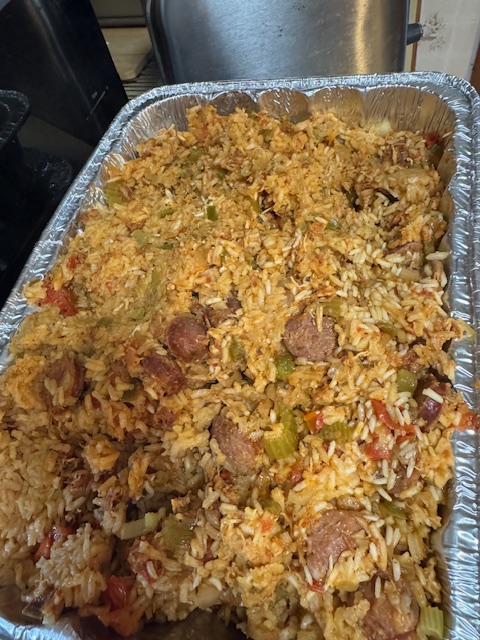 Saved! I load the allunum pans onto a half-sheet pan. The trays are not safe to move without support, and they are hot. I drive my load of NOLA goodies to First United Methodist Church and drive with care. I arrived with everything intact and delivered it to the church kitchen. Instructions are not to reheat until ten minutes (rice stays warm a long time).