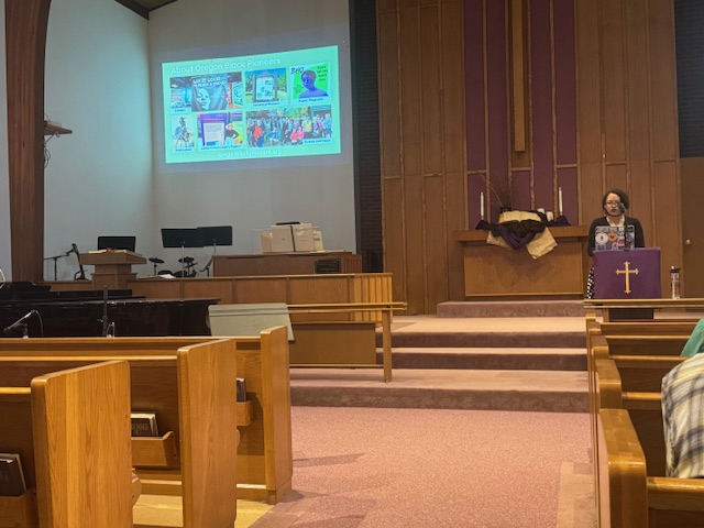 I take my spot as usher, watch, and walk into the pews as the church starts, and welcome folks I missed while I was busy. The service is compressed, and Dondrea has the reins, keeping everything moving. We have a speaker at 12:30, Mariah Rocker, Public Programs and Exhibits Manager at Oregon Black Pioneers. We cannot overrun our time slot.