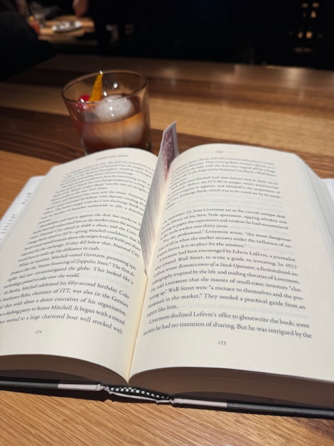 Annaliese was my waiter at the high tops of the bar. They had improved the lighting, and it was perfect for reading. No beer (too many calories and filling), but an Old Fashioned worked for me. I read about the crash, finally reaching that in the text that walks through the whole year, and realized the market had been crashing for a month before the bottom fell out on October 24, 1929, “Black Tuesday.” The story of the last-minute hidden attempts to stop the fall was fascinating. I am now on the other side of the collapse, about 2/3 of the way through the text and about 1/2 through the book (the extensive notes and bibliography add to its size). I ate California Flatbread for dinner (again, delicious but not crazy expensive or high in calories). I finished with a coffee and a shot of Amaretto to sip. I shared some book tips for Annaliese, handwriting the books and authors for her on the flotsam and jetsam you get when they use paper tickets.