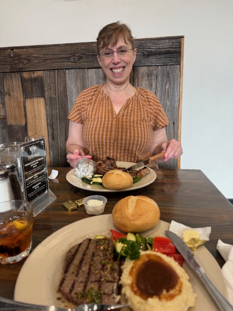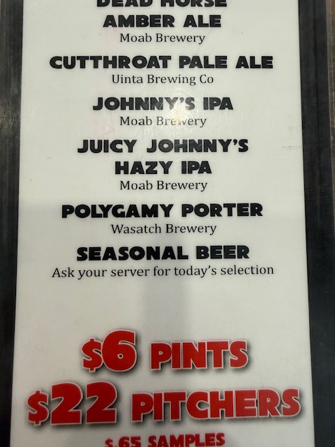 We reach our hotel passing by Arches and Canyonlands National Parks. It was after five, and we talked to the desk staff, and they gave us parking and food ideas for downtown Moab (a few miles away). We found Dewy’s, and it was perfect (if a bit loud with hard floors and ceiling to reflect the sound back). We both had steaks, and they were excellent.