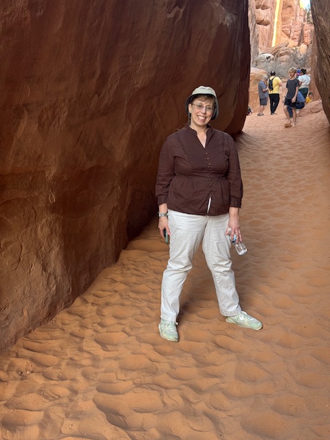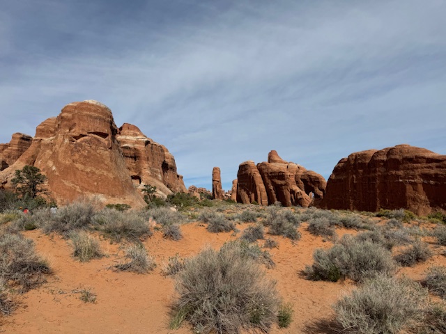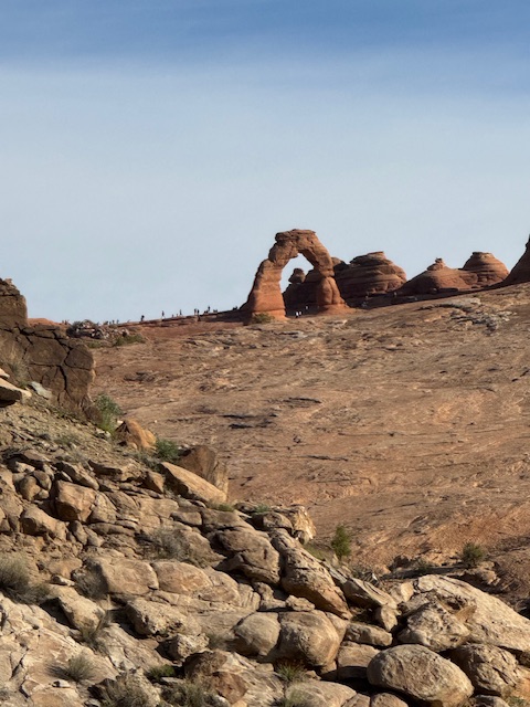 This time, a ranger checked me in after a short wait; the line was only three cars deep. I got to use my new annual pass and show it with my ID. We then stopped only a few times for photos we wanted to get in before we headed to the back of the park. We had decided on the shorter option (not 2-3 hours of uphill hiking to reach the Delicate Arch) and reached the end of the usual roads in the park. The trail we took was crushed rock, often at a 35-degree angle, for 5-minute intervals. It was tough going, but it was not yet hot, and we enjoyed the hour there and back. When we reached the lookout, the Delicate Arch was still a mile away. The view was good.