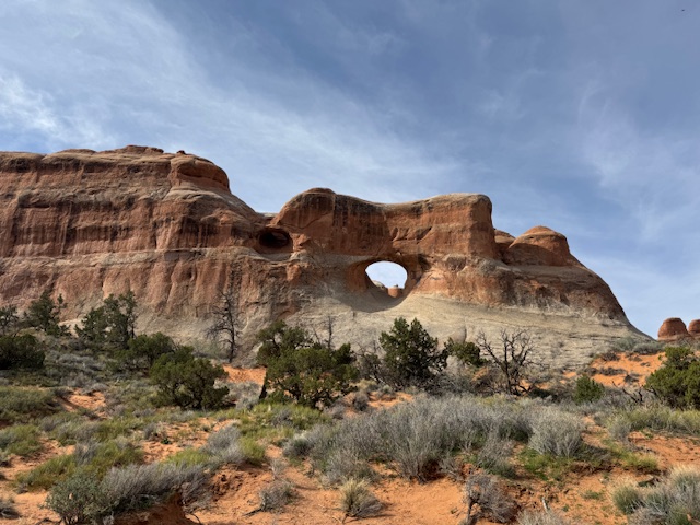 We rose early, dressed, and got to breakfast early. There were lots of people with the same plan and lines for food and coffee, but everyone was cheerful and friendly. With breakfast inside of us, we got in the rental mid-sized SUV and headed to Arches National Park again.
