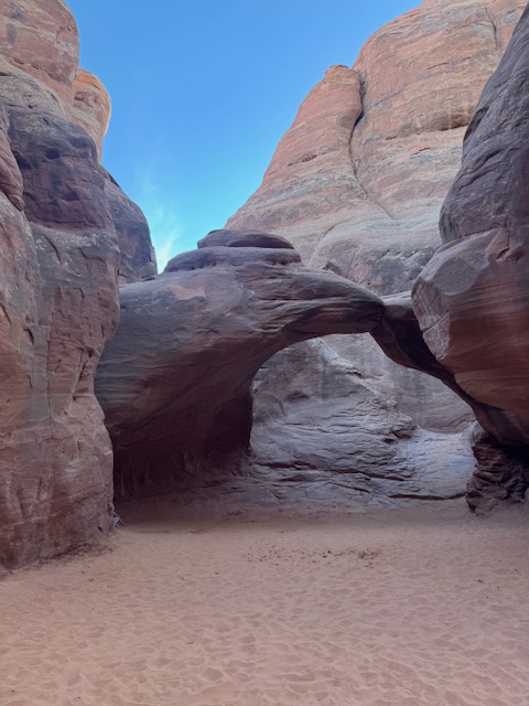We then drove toward The Devil’s Garden again, but stopped at the sand dune arch, which was an amazing experience. The arch is inside a sheer slice of red sandstone, filled with fine dust. At one point, you have to squeeze and walk up some narrow stone openings. All the time your feet are in deep sandy dust that would make any beach-going proud. It is cool in the stone, and there is a breeze. Our second favorite arch is the easiest.