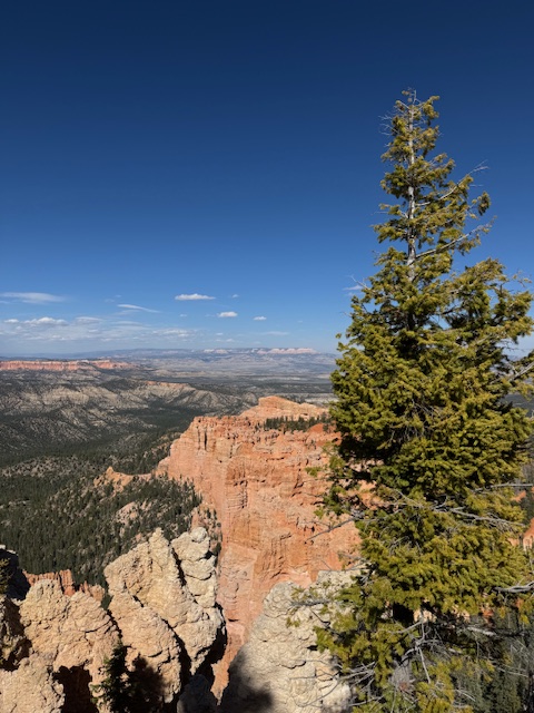 We then stopped a few times and found amazing vistas with Aqua Canyon being especially lovely. The Land Bridge was an amazing arc. And our last stop was Bryce Point with a walk out into the canyon, seemingly glued to a few stones (at least to me). The wind suddenly picked up, and I managed to save my hat by taking it off early when I heard it. I had to hold on to the railing, and I kept imagining falling off. But it was a wonderful view, mesmerizing.