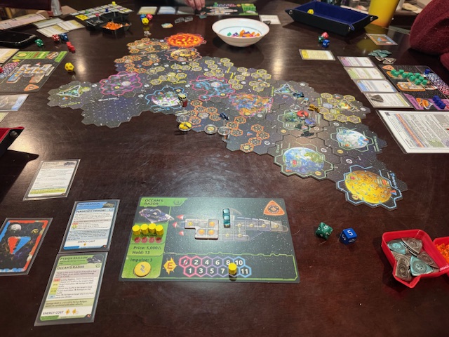 With coffee (I was sleepy from lunch, jetlag, and writing — plus a beer), terrible luck, and no rerolls or other useful advantages, I pushed on and enjoyed the game despite my bottom showing on the score. I watched Richard do his own thing, and soon he was too far ahead for me to imagine catching him, but Kathleen did scare him. The game is shorter than you expect, and you have to find a source of cash quickly (and not be bashed up by a nebula or killed by pirates) to get going. It reminded me of the board games Istanbul and Scythe, both racing-to-win games. A few more plays and we would start to get a handle on it, I think. I might have to get a copy. Hmmm. So many games, so few times to play…
