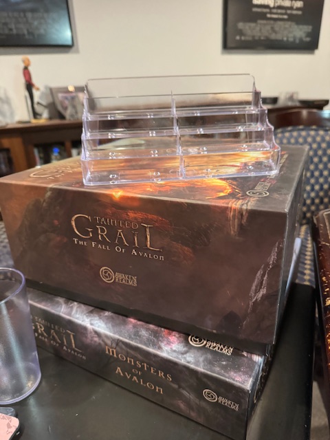 We returned to the TTPRG-style cooperative board game Tainted Grail and discovered that we were at the end of the campaign! We thought we had maybe three plays left, but no, the game asked us if we were done. We discussed this for a while (Richard was ambivalent) that our actions had previously been to save the villagers, not to restore Kamalot (yes, with a ‘K’). The game asked us if we wanted to settle with the folks we saved, and we answered yes. The game ended. We learned that had we continued, we might have saved more of the world of Tainted Grail, but we still succeeded, and we were surprised now to spend the next hour dismantling our hard-won character, good, and special secrets. It was strange to reset after 24 plays (each hour long) for the last nine months or so.