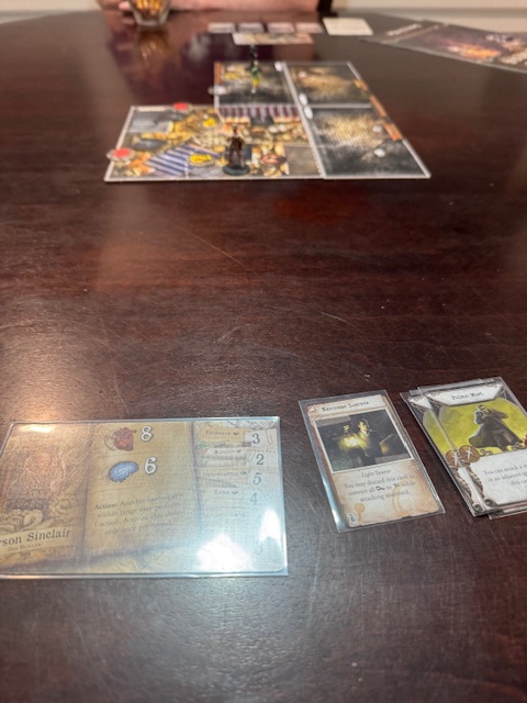 We returned James’s copy of the Mansion of Madness, which was still at Richard’s house. We set up a scenario, and I played a butler. Richard and James also picked characters they had not played before. This, too, is an app-based TTRPG-style board game, but the characters start each time anew. No campaigns. But if a character goes insane (I did), you receive a card that may give you an alternative way (including having a weapon and being alone with another character; yikes). In my case, my character was slain at the very end, but James and Richard found a way out. The rules state that the scenario can still be won if it is completed on the next turn after the death of a playing character. They succeeded, and my insanity card said that I too won as my special insane condition was met. It did not say I needed to be alive. Wow!