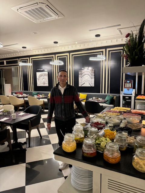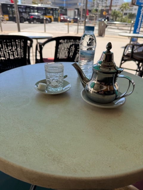 We stopped at Cafe France, which I used yesterday, and this time, we picked a table not in the flight path of the birds, and the waiter remembered me from last time (I tip well) and was happy to have me back with friends. We ordered mint tea (I ordered a snack as breakfast was back at 6:30), and we talked and enjoyed the world going by. The chaos of the taxis in front of the Hyatt was almost hypnotic as the taxis would stop, cause a snarl that was announced with massive use of horn, and then resolve. It was like a bizarre dance.