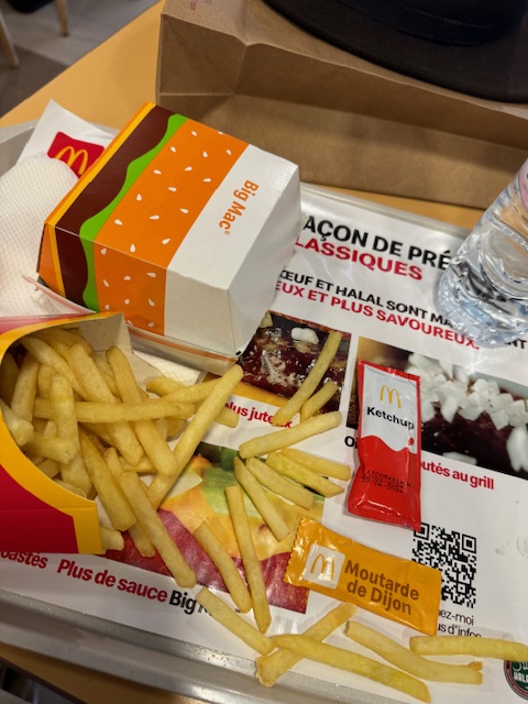 I found lunch at McDonald’s. I had been wondering what to do for lunch and suddenly found I was standing near one of these USA places. Why not? It was good and familiar. The mustard packet was French and hot—perfect on fries.